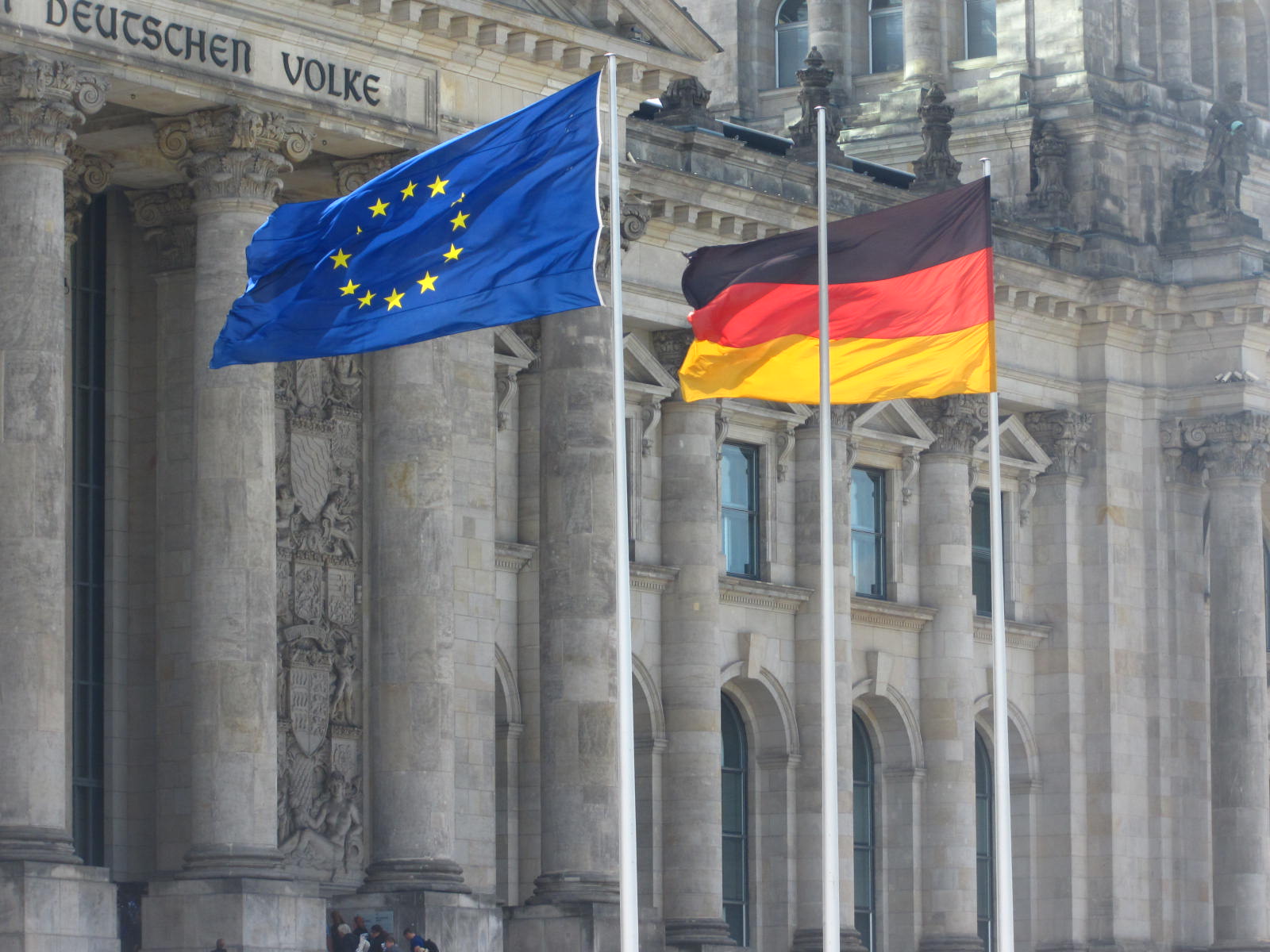 EU and German National Flags Flying Outside the Reichstag Parliament Building, Berlin, Germany